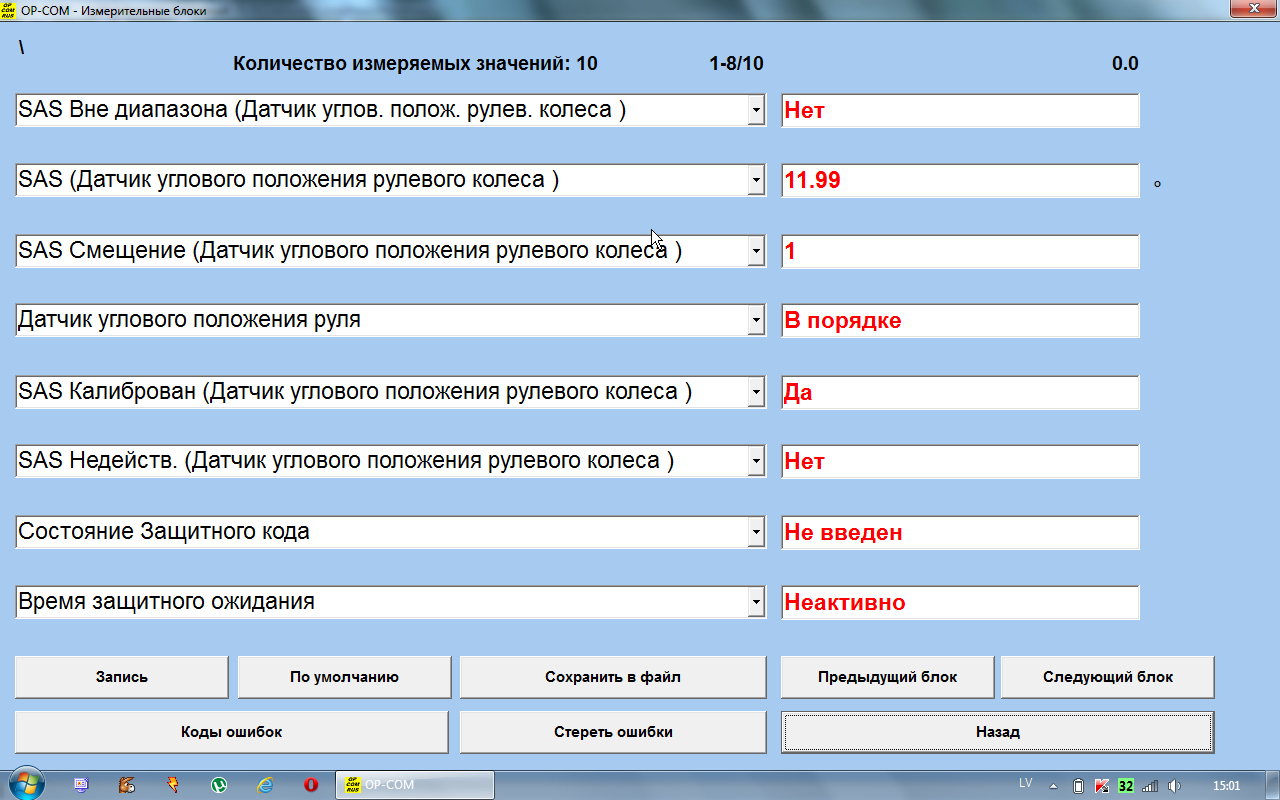...и ещё, какие данные должны быть на "Датчике угла положения рулевого колеса" - у меня показывает "1"...