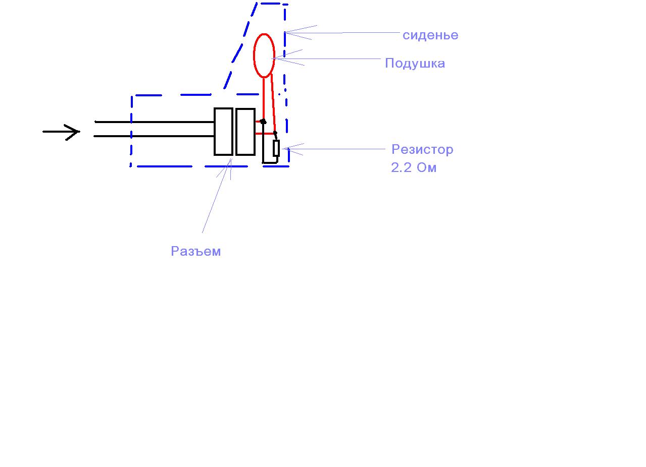 Под сиденьем проводка с разъемами. Резистор запаивай где удобней, главное параллельно в цепь подушки. И сопротивление не 2.7 Ома, как тут пишут, а 2.2 Ома, у самой подушки именно такое сопротивление, не считая окисления контактов.