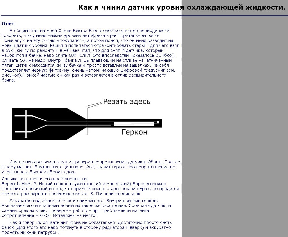 Проверил свой датчик уровня ОЖ-работает,геркон,на снятом датчике, при подносе магнита замыкается.Значит виноват поплавок в бачке.Я так понял,что когда уровень нормальный,то геркон замкнут,табличка не вылазит,а когда уровень уменьшается,поплавок с магнитом опускается,контакты геркона размыкаются и вылазит табличка "Мал уровень ОЖ".Тогда я взял и вставил перемычку в разъем,который подходит к датчику ож(т.е геркон,как бы замкнут) и табличка на дисплее не стала вылазить,но перестал включаться вентилятор на радиаторе,из-за этого чуть не вскипятил движок.Вытащил перемычку-всё снова заработало нормально.В чем дело?