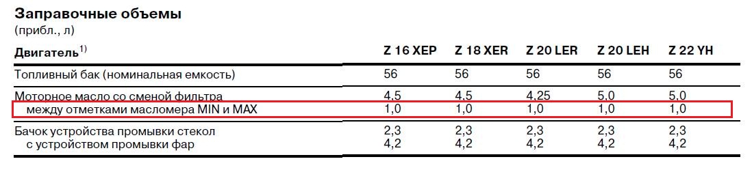 У моторов z16xe. z18xe. z22ce. Y20DTH. тоже от мин. до мах. один литр. Прочитал в мануале он правда на немецком но по таблице понятно что по чём.Там же и расход масла указан 0.6 л на 1000км пробега.