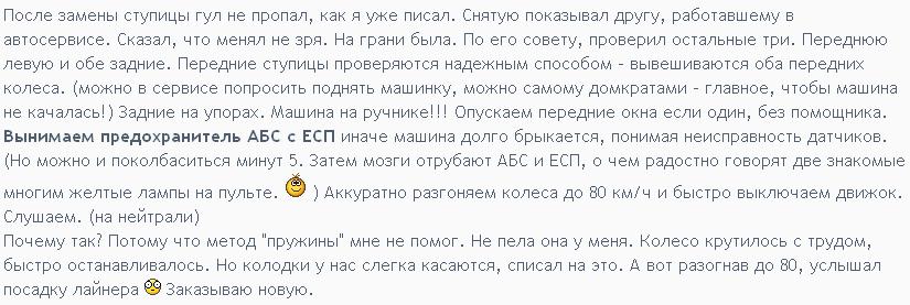 Всем привет ! В пятницу вырвавшись из пробок на простор траасы обнаружил, что при скорости 80 кмв час появился гул или вой на высоких тонах и при дальнейшем наборе скорости увеличивается разгонялся до 120 км в час, подумал что подшипник. Сегодня приехав в автосервис где ремонтирую авто мастер-приемщик прокатившись со мной сказал что тгул слышит ,но определить откуда тосно он не может, слесарь загнав машину на подьемник покрутив колеса вручную и на скорости тоже точно не определил сказали так: или подшипник или коробка, надо еще поездить пока о не станет сильнее, чтобы определить! У кого была такая проблема отпишитесь пожалуста! Времени мало 2 августа еду на авто в ховатию.